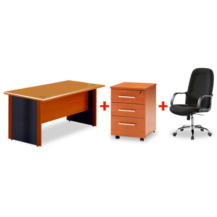 Un espace de travail trés bien optimisé et compact, ce bureau s’intégrera parfaitement dans un environnement clos ou bien en open space. Dimension : 160*80 cm – Fauteuil Président en tissu avec accoudoirs, Assise sur branche de 5 roulettes socle en chrome , réglable en hauteur – Caisson mobile : 3 tiroirs avec fermeture à serrure centrale Couleur disponible : cerisier